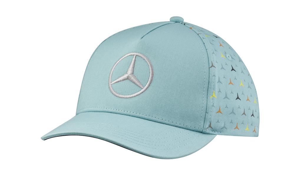Cooles Design für die Kleinen: Die türkise Cap für Kinder ist aus biologischer Baumwolle gefertigt und lässt sich dank eines Verstellclips einfach an die Kopfform ihres Trägers anpassen. Und auch optisch punktet die 5-Panel Baseball Cap auf ganzer Linie und setzt auf seitliche sowie rückwärtige Panels, die mit einem bunten und silberfarben reflektierenden Star Pattern bedruckt sind. Ein gestickter Mercedes Stern vorne sowie die Schirmunterseite in Dunkelblau runden das Design gekonnt ab.